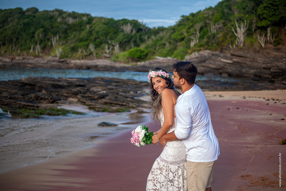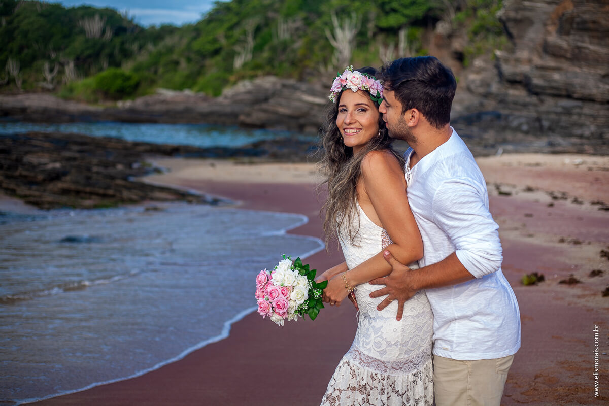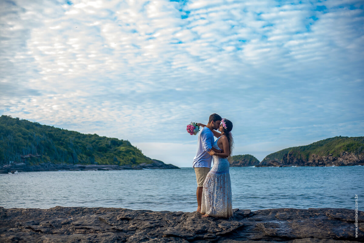 Escolhemos a Praia de Tucuns para o início de nosso registro memorável. O sol nascendo no mar, a encosta de pedras e as ondas quebrando na areia davam o contorno e a silhueta para a composição das fotos de amor deste casal apaixonado. Difícil não se impactar com a beleza da natureza e com as trocas de carinho, olhar e muitos beijos.